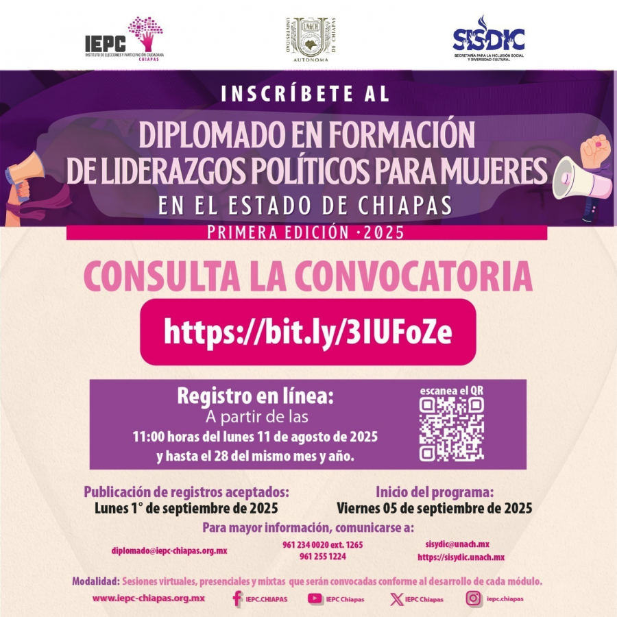 El Instituto de Elecciones y Participación Ciudadana (IEPC), en colaboración con la Universidad Autónoma de Chiapas (UNACH) a través de la Secretaría para la Inclusión Social y Diversidad Cultural (SISyDIC), te invita a formar parte de la Primera Edición 2025 de este programa que busca fortalecer las capacidades de liderazgo y participación política de las mujeres en nuestro estado.